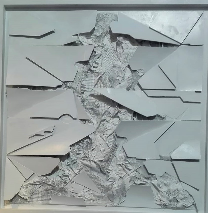 Il titolo dato all’ultima mostra: “pensieri tridimensionali “, nasce dal fatto che le opere proposte, tutte realizzate tra il 2013 e il 2018, sono pittosculture, opere ibride in cui il colore si inserisce e completa una sperimentazione tridimensionale pseudo-scultorea. Non si tratta di un processo scolastico lineare che mi ha portato dalla bidimensionalità alla spazialità; infatti, altre mie opere, non esposte nella mostra, pur realizzate su superfici, restituiscono livelli, relazioni e tagli che rimandano, comunque, a esplorazioni indiscutibilmente spaziali. La selezione, con l’obiettivo della “provocazione”, è suggerita, invece, dalla constatazione che il nostro tempo, condizionato in modo crescente da vocazioni mercantili e da relazioni virtuali che hanno contaminato anche l’arte, si esprime e comunica, sempre più ostinatamente, attraverso superfici, che, con finalità mediatiche, propongono una tecnologia bulimica multimediale, mutevole, virtuale, spesso fatua……! Una tendenza deviante che, per il nostro campo, rischia di svuotare il pensiero creativo dell’artista e di limitarne seriamente quello critico; alimentando, così, l’altra tendenza, catastrofista, secondo la quale la pittura sarebbe da considerarsi morta, in favore degli “eventi”, delle invenzioni multimediali e interattive, delle azioni performative degli “artisti”. Mi piace sperare che la mostra, con la sua tridimensionalità, possa contribuire a frenare questo dominio imperante della “superficie”, contrapponendogli l’espressività del materiale, la concretezza delle tre dimensioni, la centralità dell’artista nella ricerca affannosa della sua “verità” creativa. E possa, indirettamente, rilanciare la certezza che pittura e scultura possano ancora emozionare e sorprendere, sia pure “dilatando i confini della singola opera” (bella, a questo proposito, la recente difesa di Massimo Recalcati, nel suo recente Il mistero delle cose).